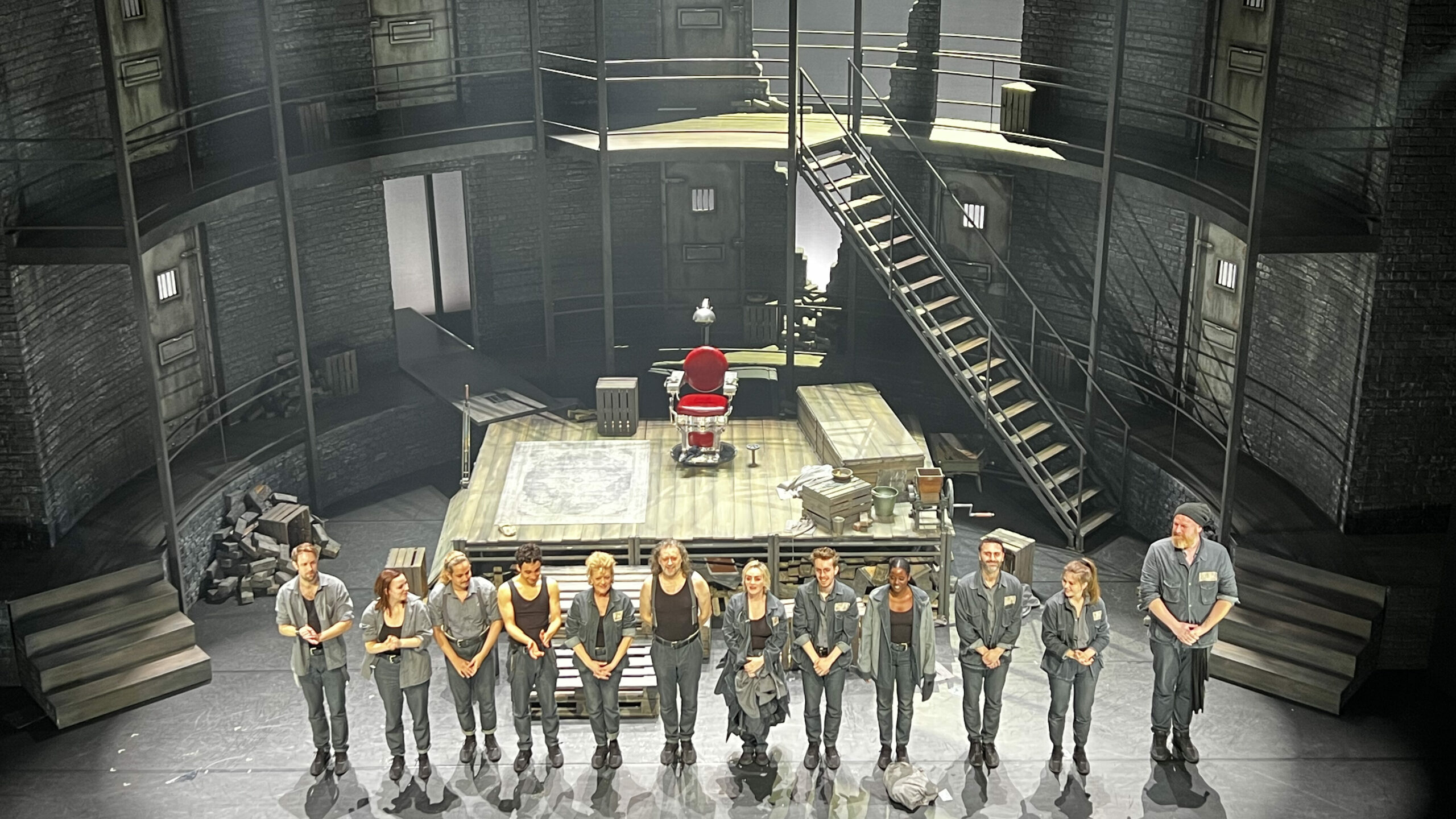 De creatives hebben er een modern toneelbeeld van gemaakt: iedereen is in blue jeans gehuld (kostuums: Yan Tax), we zien het interieur van een gevangenis (decor: Carla Jansen Hofelt) waar in het midden een felrode babierstoel de eyecatcher is. De vertaling van Koen van Dijk (ooit door hem geschreven omdat hij met een gebroken been aan huis gekluisterd was) is opgefrist, maar is even doordacht als de originele teksten van Sondheim en Hugh Wheeler. De vertalingen passen precies op de noten en dat is toch wel een kunst!